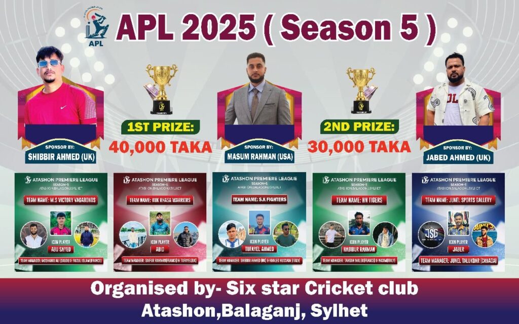উল্লেখ্য, আতাশন সিক্স স্টার ক্রিকেট ক্লাবের উদ্যোগে আয়োজিত এই টুর্নামেন্টটি প্রথম শুরু হয় ২০২১ সালে। ধারাবাহিকতা বজায় রেখে এবারের পঞ্চম আসর স্থানীয় ক্রীড়া সংস্কৃতিকে আরও সমৃদ্ধ করবে বলে আশা করছে আয়োজকরা।